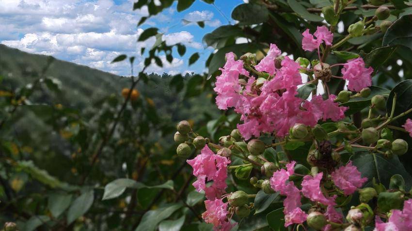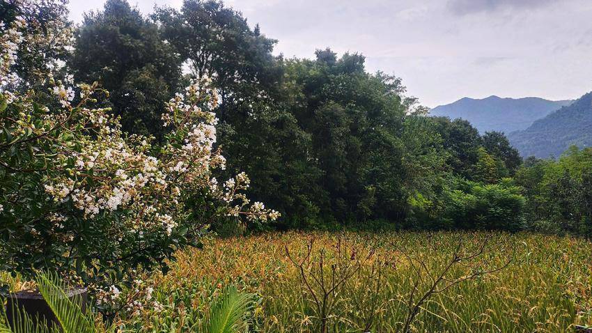 路边的紫薇花将胭脂色的花瓣轻轻洒在田埂上,恰似秋日捎来的温柔情话。湿润的空气里,雨后的清芬悄然浮动;远处山岚如轻纱般漫卷,把远山的轮廓晕染成一幅写意的水墨长卷。